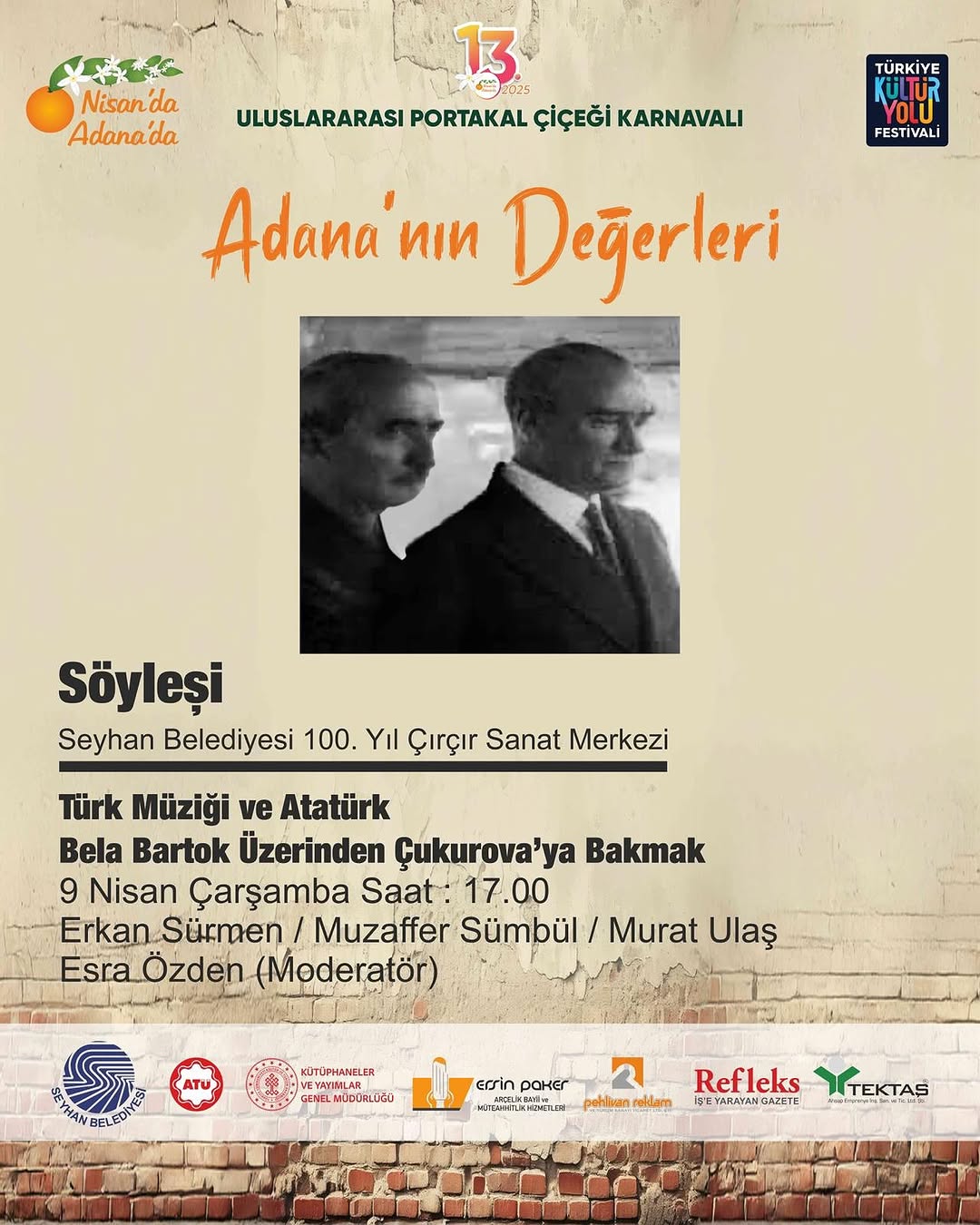 Türk Halk Müziği'nin önde gelen sanatçılarından Adanalı Duayen Erkan Sürmen, bugün söyleşi yapacak. Söyleşi, Seyhan Belediyesi 100. Yıl Çırçır Sanat Merkezi'nde gerçekleşecek. 17:00'da başlayacak söyleşinin başlığı ''Türk Müziği ve Atatürk Bela Bartok Üzerinden Çukurova'ya Bakmak'' olacak.