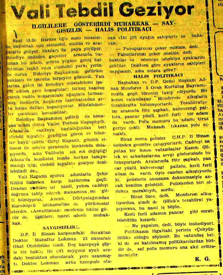 Belediye Başkanı'nın şoförü ile konuşan adam Adana Valisi idi. Adana'da göreve başladığından beri tebdil kıyafet gezdiğini görenler ve bilenler hayli çoktu. Gerçi Vali günlük elbisesi ile şehrin şurasında burasında dolaşıyordu, ama valilerin sık sık değiştiği Adana'da kendisini henüz herkes tanıyamadığı için tebdil kıyafet geziyor denilebilir de...