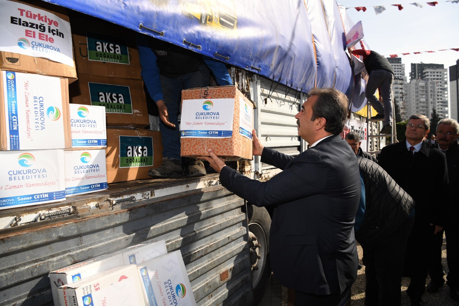 Elazığ’ın Sivrice ilçesinde meydana gelen 6,8 büyüklüğündeki depremin ardından Çukurova Belediyesi’nin açtığı kampanyada toplanan giysi, kuru gıda, temizlik malzemelerini taşıyan tır Başkan Soner Çetin tarafından uğurlandı.