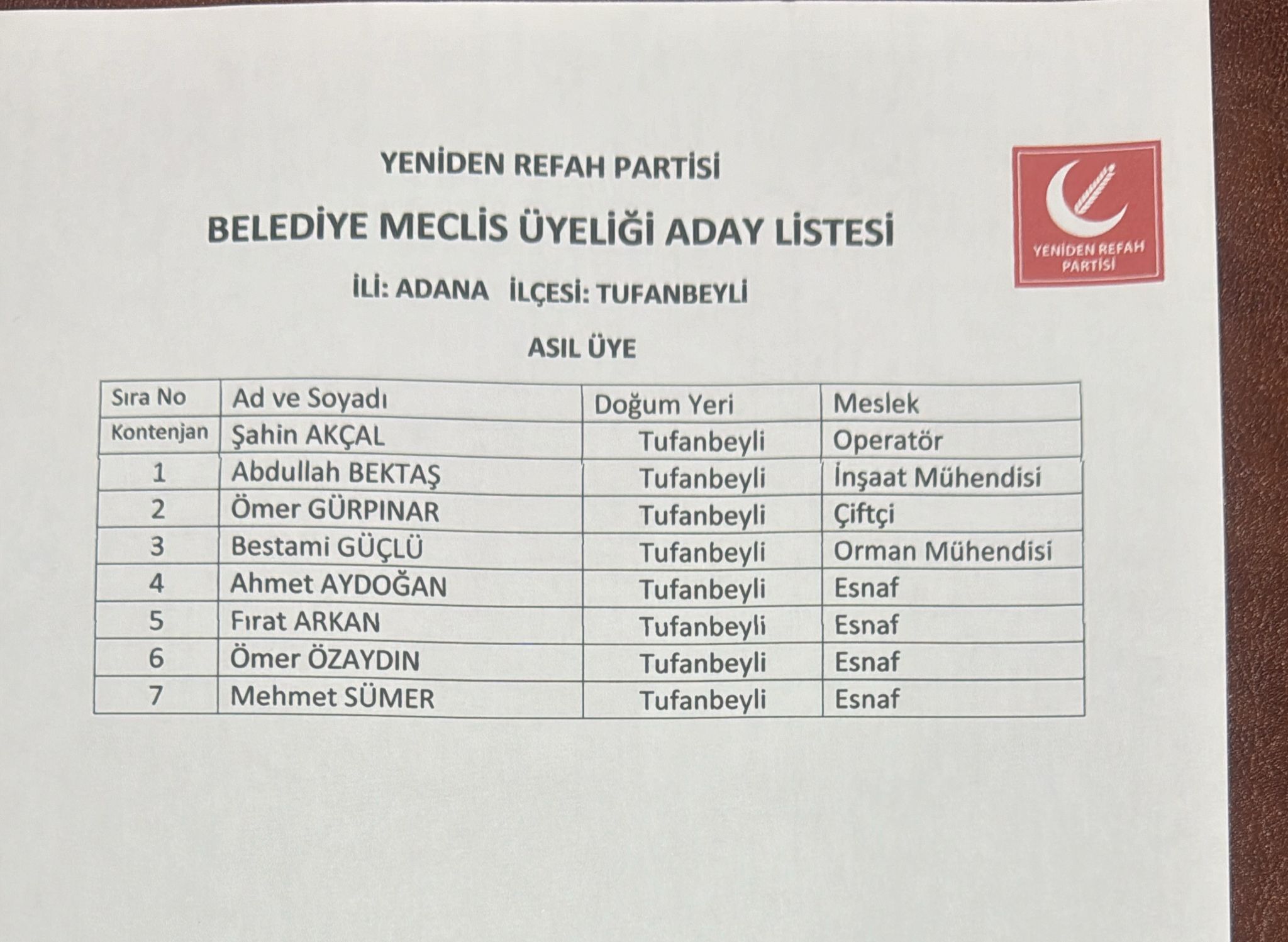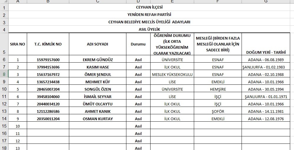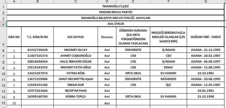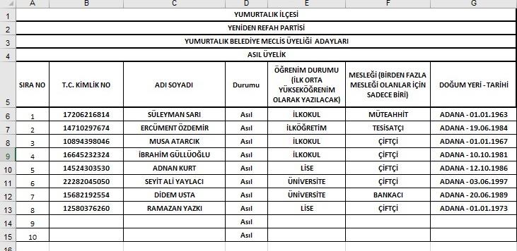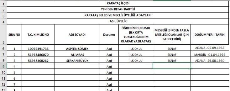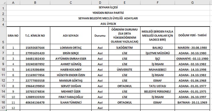 Yeniden Refah Partisi Adana ilçe meclis üyesi aday listeleri tam listesi