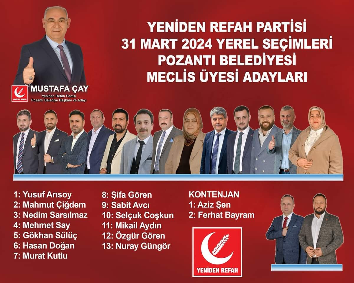 Yeniden Refah Partisi Adana'da; Seyhan, Yüreğir, Ceyhan, İmamoğlu, Karataş, Yumurtalık, Pozantı, Tufanbeyli'de meclis üyesi aday listelerini YSK'ya teslim etti.